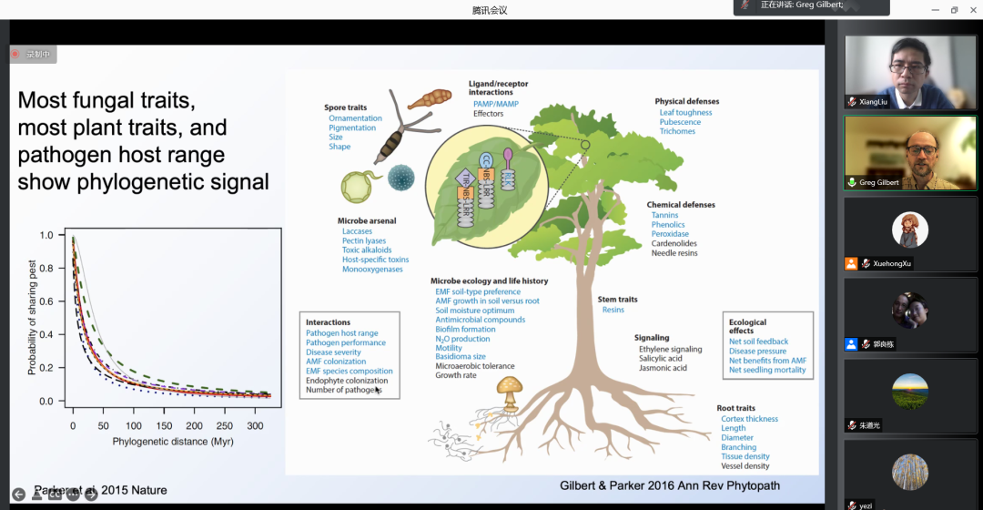 Gregory Gilbert教授的报告关注于植物内生真菌这一具有重要生态功能的类群。他的研究通过对农田、森林和草甸三种生境中不同植物叶片内生真菌的ITS序列进行扩增子测序,证实内生真菌往往具有较窄的宿主范围,且具有较强的生境偏好性。他的研究同时构建了植物-内生真菌的互作关系网络,证实网络内部的模块性有助于解释内生真菌中潜在病原菌的在一定宿主范围内的外溢现象。