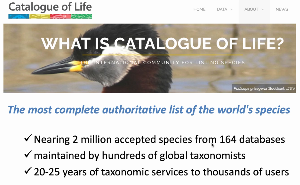 会议最后,荷兰莱顿生物多样性中心物种2000(Species 2000)秘书处的Olaf Banki博士介绍了全球生物物种名录(Catalogue of Life,COL)的编研进展。COL是当前可用的最综合和最权威的全球生物物种索引,它整合了多个来源的物种名录。与以往名录呈现方式不同,COL新网站直接展示最新的名录数据,不再以年度更新和月度更新的名录展示。他在报告中还对COL网站框架和下一步的工作计划进行了分享。COL将开展开放数据授权、提供更多网站服务、不断更新全球生物物种名录2021版等核心工作。同时,也将继续加强与全球生物多样性信息网络(GBIF)的合作,将COL应用到GBIF分类学核心框架中。