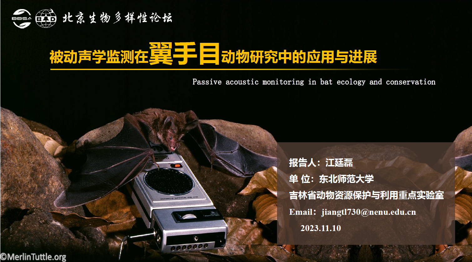 江廷磊教授从被动声学监测技术(passive acoustic monitoring, PAM)和相关监测设备的发展、及其在翼手目研究中的应用方面进行了分享。被动声学监测是一种通过监听和记录自然环境中的声音来进行监测的方法,可以据此推断动物的分布、生理状态、丰度和行为等信息,最早应用于水生动物的监测和研究,现已广泛应用于陆生动物研究领域,成为生物多样性评估的一项重要手段。蝙蝠是PAM研究的重要陆生动物类群。根据蝙蝠声学研究的挑战和优势,报告人详细介绍了国内外几种常用监测设备的优缺点及工作原理,说明如何根据不同研究目的选择适当的监测设备。接着,以实际案例分享了目前PAM在翼手目动物中的诸如声学监测技术及分析方法优化、物种识别、多样性调查及分布预测、生境利用及活动模式、种群监测、保护和管理等方向的研究进展。最后,对中国蝙蝠声学监测今后的发展提出了建议和思考。