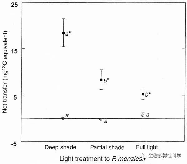 图1 在第一个(2年生幼苗,空心圆)和第二个(3年生苗木,实心圆)实验年,在深荫、部分荫和无遮阴环境下,从纸桦到花旗松的平均净转移量。