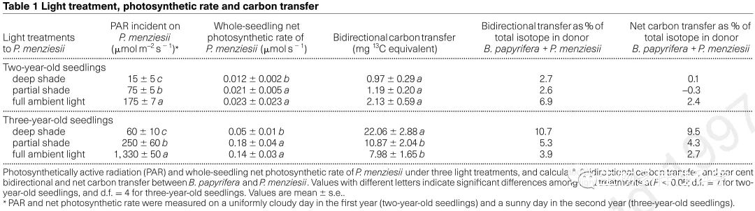 作者在野外使用13C和14C的互惠标记来研究两种树种之间的地下C转移。这是第一个使用互反标记来研究双向和净碳转移的研究。当幼苗种植在森林土壤中2-3年时,研究了两个生长季节的碳转移。外生菌根纸桦和花旗松和北美乔柏三组苗间隔0.5 m种植。这三种树种自然同时生长在实验区。北美乔柏的作用是检测通过土壤途径 (即通过呼吸的气态CO2、渗出物、脱落的根和真菌细胞) 间接同位素运动。在标记前4周到6周,对花旗松幼苗进行3种光照处理下:深遮荫、部分遮荫和全光(表1)。遮荫期结束后,每组的纸桦和花旗松分别用13CO2或14CO2气体进行脉冲标记。这种方法能够检测出一株幼苗从另一株幼苗接收到的碳同位素。互反标记方案应用于第一年的复制幼苗组,以解释13C和14C之间绝对同位素固定的差异。在最低光合有效辐射水平为800 mmol m-2 s-1的全环境光下脉冲标记2 h,然后在光照处理下进行9天追逐期。然后将幼苗收获并分离成叶、茎、粗根和细根。将地面组织燃烧成CO2,用质谱法分析其13C丰度,用液体闪烁法分析其14C丰度。