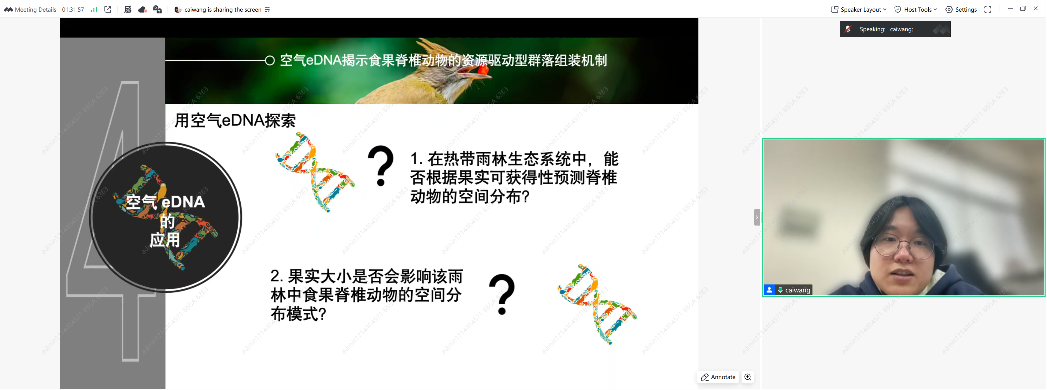 中国科学院西双版纳热带植物园蔡望博士的报告从2015年空气DNA(airborne eDNA)兴起,最初用于检测空气中的微生物,2022年英丹动物园首次证明其可精确定位脊椎动物,遂成生态监测新热点开始讲起。蔡望介绍空气含花粉、皮屑、鳞片及昆虫碎片,无人机、飞机与地面泵均可采样,对树栖及小型动物敏感度优于红外相机,且可复用现有大气监测网,实现大规模、高时空分辨率调查。然而,风速、降水、UV及生境开放性等因素显著影响捕获效率,采样器类型、PCR与生物信息流程亦带来假阴/阳性,亟需标准化协议。目前airborne eDNA技术应用已覆盖洞穴蝙蝠、无水森林、入侵昆虫、病原体及花粉致敏监测。蔡望在西双版纳20 ha样地利用airborne eDNA耦合占据模型,发现果树丰度与小型果实数量显著预测食果兽、鸟占据概率,验证了其解析“资源–动物”空间耦合机制的能力。蔡望指出,未来可结合无人机、三代纳米测序与遥感等技术,并将检测范围拓展至树冠层及崎岖山区,建立从采样到建模的全链标准。但airborne eDNA并非替代传统手段,而是与相机、水eDNA等互补,为生物多样性评估与生态过程研究提供可扩展、非侵入的新工具。