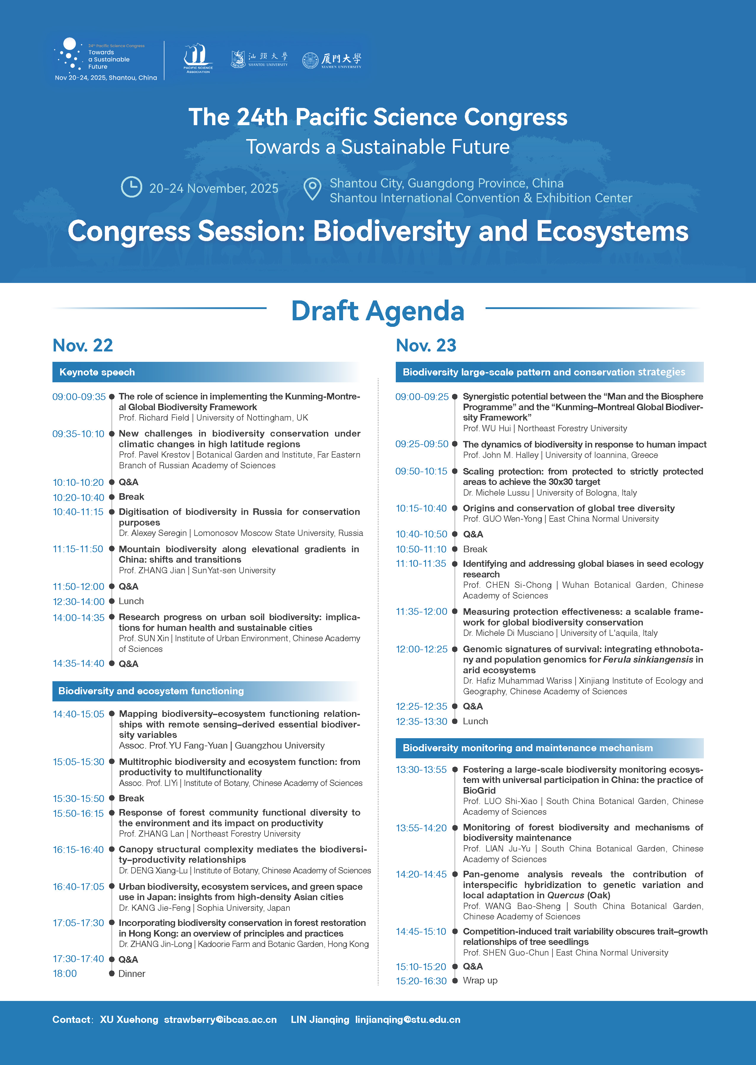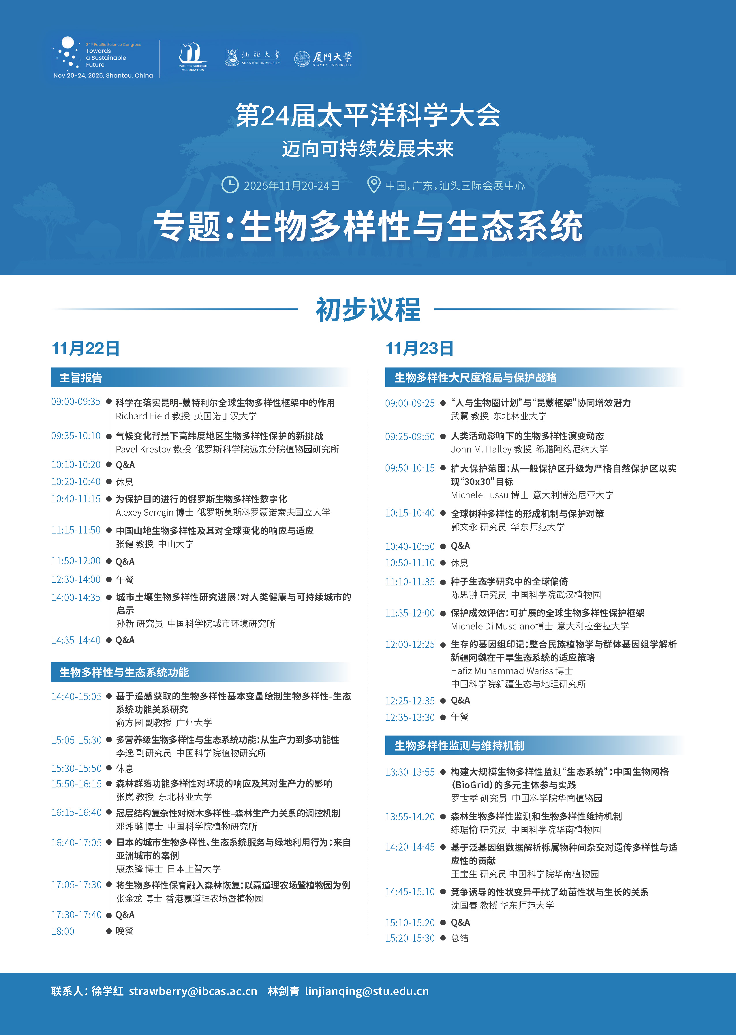 专题日程 | 第24届太平洋科学大会“生物多样性与生态系统”专题